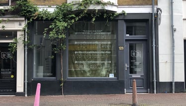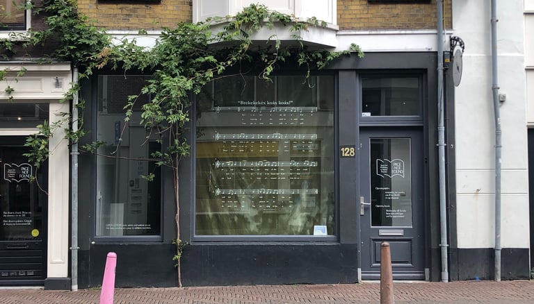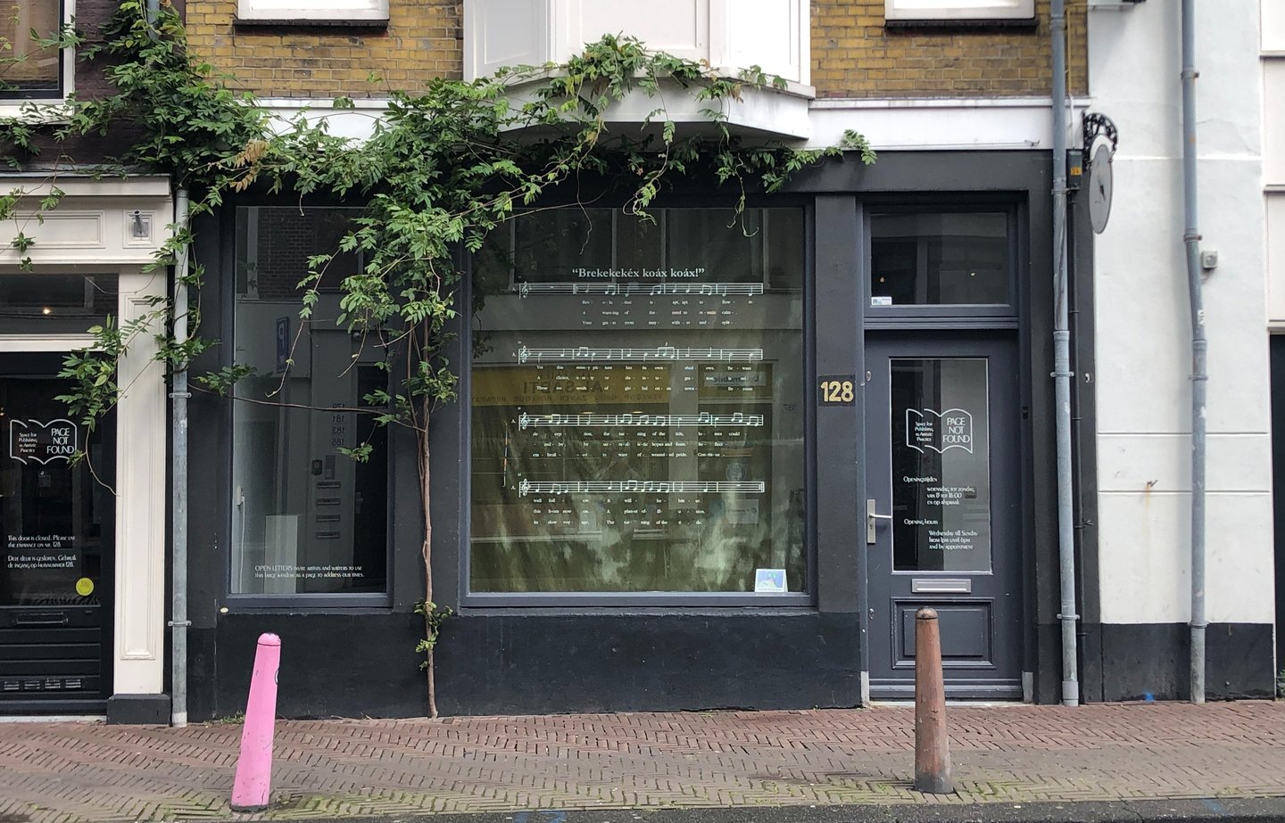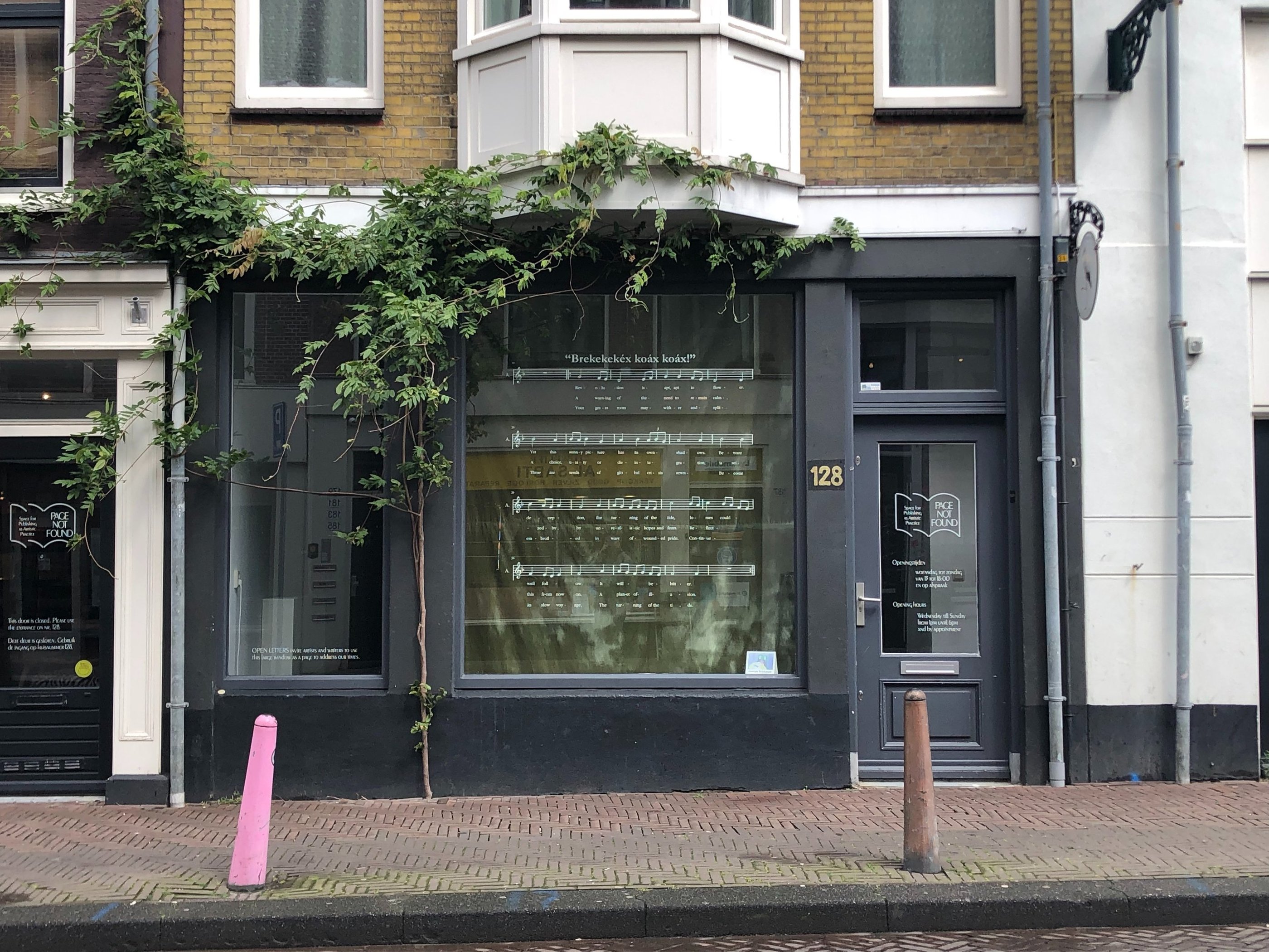 The score for “Brekekekéx koáx koáx!” as a vinyl window display at Page Not Found, The Hague.