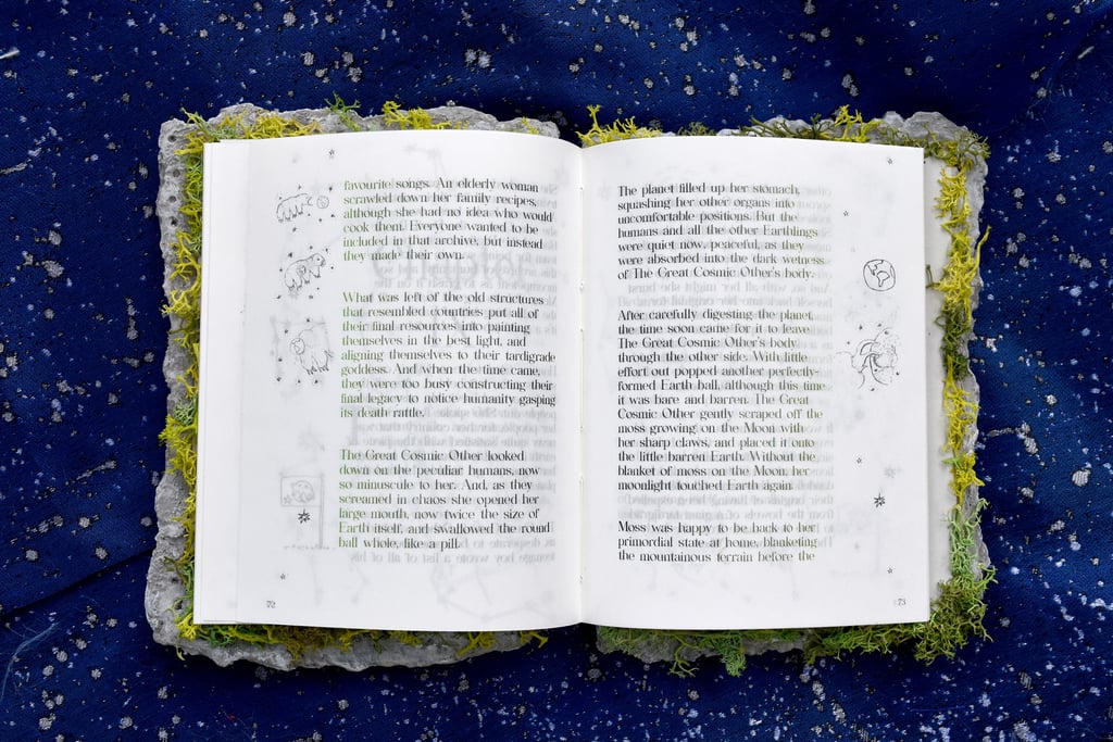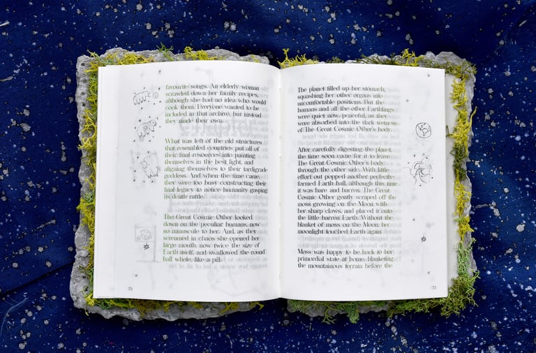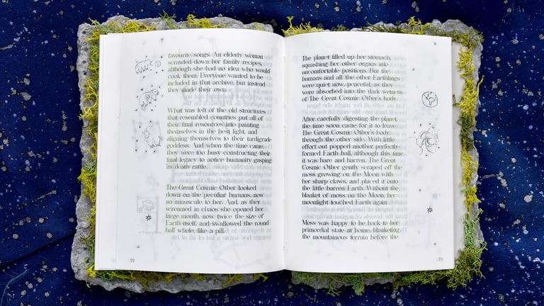 A multiform research project about a colony of tardigrades who crash-landed on the moon. Tardigrades, known colloquially as moss piglets or water bears, are microscopic animals found living in moist environments across all habitats of the world. They are one of the only animals known to have survived all five mass extinctions. Following the crash of a spacecraft in 2019, they are also the first known Earthling to (potentially) reside on the moon.