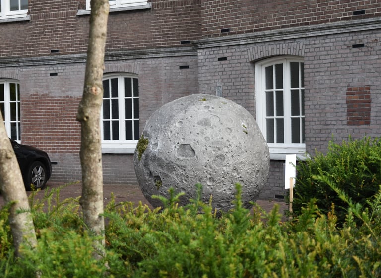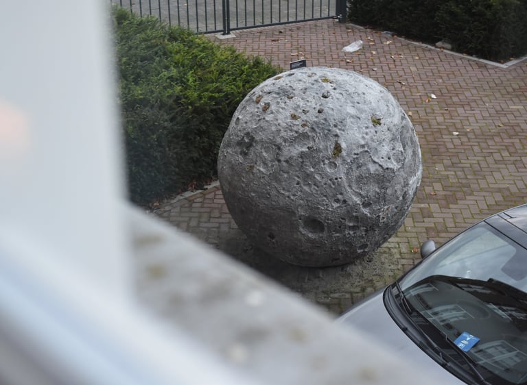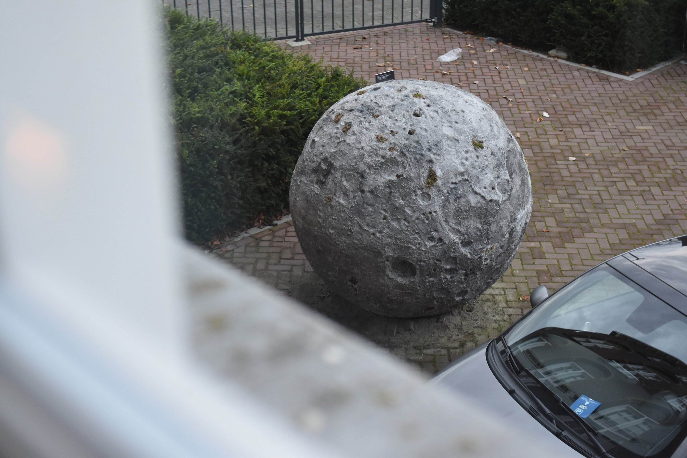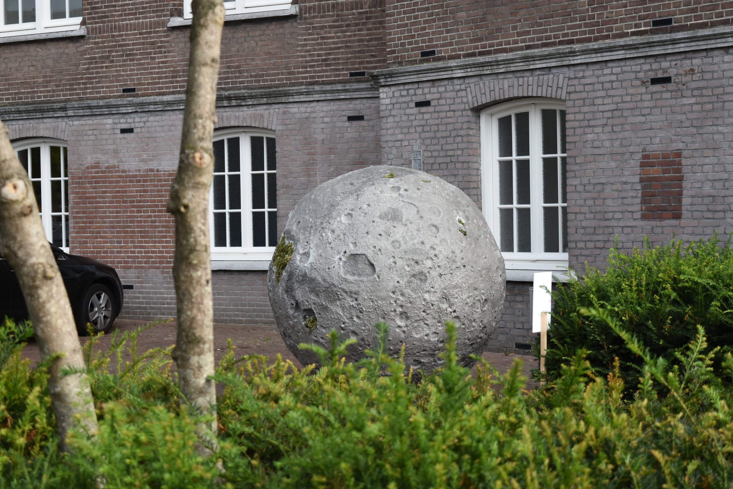 It was initially commissioned as a work for public space in Breda. I installed the moon so that it appeared to have crash-landed to Earth, and particularly chose a site representative of the society that falls apart in In the beginning…: the paved grounds of luxury capitalism, a hotel carpark.