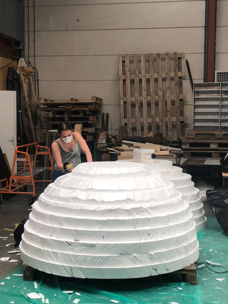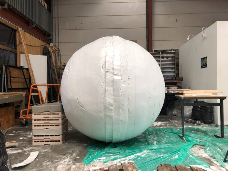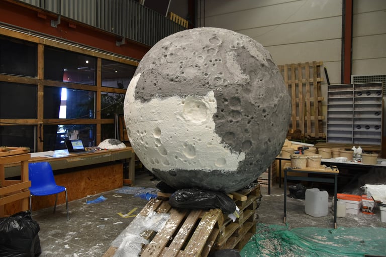 MEDIUM: Polystyrene moon sculpture laminated in non-toxic resin and sand, mosses, 180 x 180 x 180cm